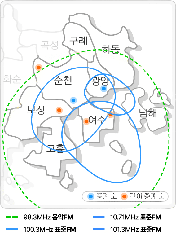 | 음악 FM | 여수 구봉산 송신소 | 98.3MHz | 2kW | 일원 : 여수 일부 : 광양, 순천, 고흥, 보성, 남해, 하동 |