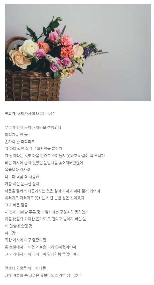 커뮤니티 좋은생각 장미가시에 내리는 눈은 등록일 : 2018-02-02 16:23 kang****@y****.kr 조회수 : 168 여러분의 의견을 남겨주세요 ※ 댓글 작성시 상대방에 대한 배려와 책임을 담아 깨끗한 댓글 환경에 동참해 주세요. 0/2000 등록 이전글 다음글 목록