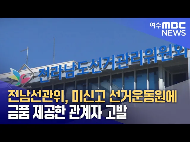 전라남도선거관리위원회가 등록되지 않은 선거운동원에게금품을 제공한 혐의로 모 정당 소속선거연락소장을 검찰에 고발했습니다.이 소장은 지난 21대 대선에서선거관리위원회에 신고되지 않은선거운동원 4명에게 835만 원의금품을 제공한 혐의를 받고 있습니다.또, 같은 사무소 회계책임자도선거사무관계자에게 78만 원 상...
