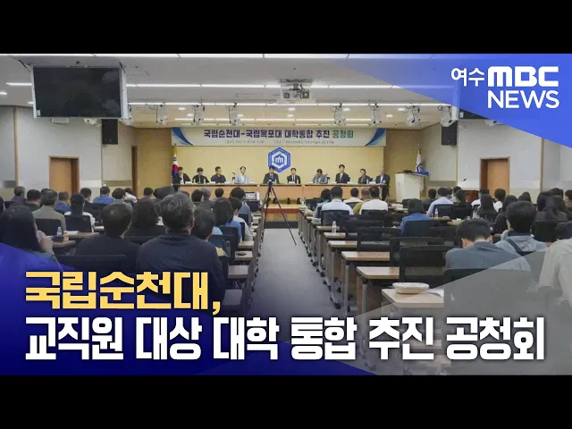 국립순천대학교가 어제(30) 전체 교직원을 대상으로대학 통합 추진 공청회을 개최했습니다.이번 공청회는 국립순천대-목포대 통합 추진 현황과앞으로 계획, 주요 쟁점 사항을 공유하고 의견을 수렴하기 위해 마련됐습니다.이병운 총장을 비롯해대학 주요 보직자와 교수들이 참석했으며,대학은 구성원의 다양한 의견을 듣고...