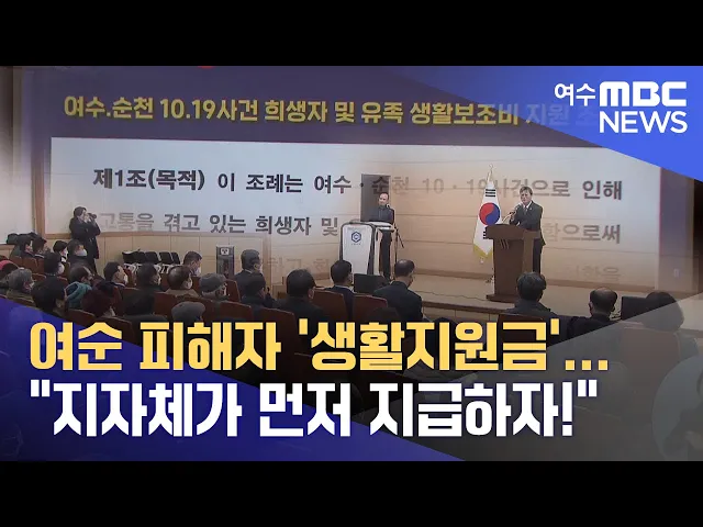 ◀ANC▶ 여순사건 특별법이 시행된 지 1년을 맞았지만, 피해자들에 대한 실질적인 보상과 지원은 요원한 상황인데요. 지자체 차원에서 희생자와 유족에게 '생활 보조비'를 지급하는 내용의 조례안이 조만간 도의회에 발의될 것으로 보입니다. 문형철 기자입니다. ◀VCR▶ 지난해 1월 말부터 시행된 여순사건 특별법에는 ...