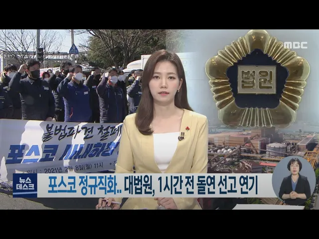 ◀ANC▶포스코 협력업체 노동자들이 11년째 이어오던정규직 지위 인정 소송의 대법원 판결이 오늘(30)로 예정돼 있었는데요.그런데 대법원이 불과 선고 1시간 전, 이례적으로 선고를 연기하면서 또 한 해를 넘기게 됐습니다.노동계와 정치권에선 비판의 목소리가 나왔습니다.강서영 기자입니다.◀VCR▶첫 소송은 2011년, ...