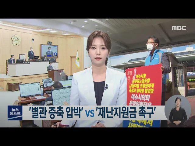 ◀ANC▶여수시가 별관증축 문제로 시의회를 압박하자,의회는 시민단체와 함께 재난지원금 요구로 응수하며,국면 전환을 꾀하고 있습니다.인근 순천시의 청사 건립에 대한 협치가 돋보이는 가운데,시와 의회간의 소모적이고 지리한 논쟁은내년 지방선거 이전까지 계속될 조짐을 보이고 있습니다.최우식 기자가 보도합니다.◀...