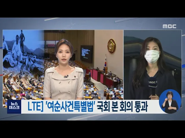 ◀ANC▶지역민들의 오랜 숙원인 여순사건특별법이 73년만에 드디어 제정됐습니다. 국회에 나가 있는 취재 기자 연결합니다. 조희원 기자, 법안이 본 회의를 통과 했습니다? ◀기자 S/U▶네, 그렇습니다. 오늘 오후 2시, 국회 로텐더홀에서 본 회의가 시작됐습니다.특별법은 10번째 안건으로 배정되어 2시 50분쯤 투표가 진...