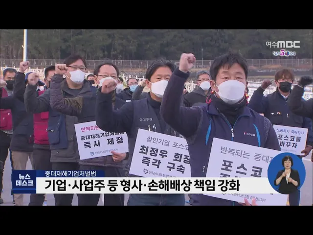 ◀ANC▶잇따르고 있는 산업재해로 안타까운 사망사고역시 끊이지 않고 있습니다.이런 가운데 중대재해와 관련해 사업주의 책임을 강화하는 법안이 국회에서 논의되고 있는데요.여당의 적극적인 관심이 필요하다는 지적입니다.김종수 기자가 보도합니다. ◀VCR▶증가하는 산업재해와 이에 따른 노동자들의 사망사고.정부 ...