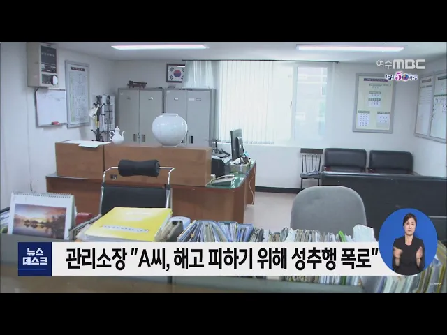 시청자 여러분 안녕하십니까. 월요일 밤 여수MBC 뉴스데스크 시작합니다. 오늘 저희뉴스는 우리 주변 곳곳에 만연해 있는 성추행 관행과 이에 대응하는 시민들의 자세에 대해 생각해 보자는 보도로 시작합니다. 여수의 한 아파트 관리소장이 아파트 미화원을 지속적으로 성추행한 혐의가 드러나 검찰에 송치됐습니다. 그런...