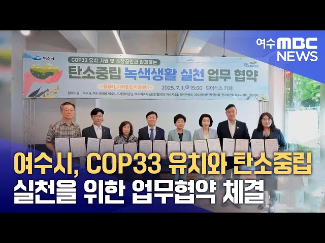 여수시가제33차 유엔기후변화협약 당사국총회 유치와 2026여수세계섬박람회의 성공적인 개최를 위해 7개 유관 기관·단체와 탄소중립 녹색생활 실천 업무협약을 체결했습니다.이번 협약은일회용품 사용을 줄이고 탄소배출 감소에 참여하는일상 속 녹색생활 실천을 장려하기 위한 것으로,시의회와 도시관리공단, 소상공인연합...