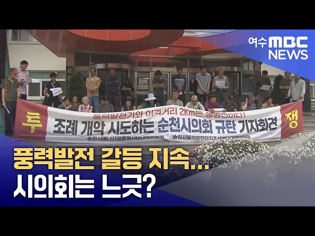 ◀ 앵 커 ▶풍력발전시설 설치 조건을 일부 완화하는 조례 개정안이 순천시의회에 발의된 지 1년 3개월이 지났습니다.지역 주민들이 찬반으로 갈려지금까지 갈등을 빚고 있지만,시의회는 세 차례나 보류 결정을 내리면서 내부에서도 비판의 목소리가 커지고 있습니다.문형철 기자입니다. ◀ 리포트 ▶지난해 4월 순천시의회에 ...