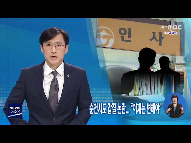 ◀ANC▶여수시에 이어 순천시에서도 간부급 공무원의 업무상 갑질 논란이 일고 있습니다.일단 업무공간을 분리하는 인사발령이 났는데, '직장 내 괴롭힘 금지법'에 대한 공직사회 전반의 인식변화가 촉구되고 있습니다.박민주기자입니다. ◀END▶순천시 보건소에 근무하는 5급 A과장은 지난달 중순, 총무과로 발령됐습니...
