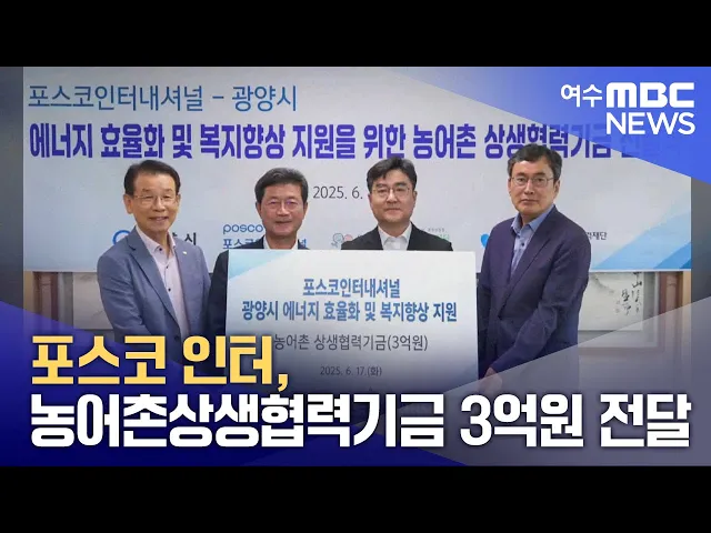 포스코인터내셔널이 광양시 사랑나눔복지재단에 농어촌 상생협력기금 3억원을 전달했습니다이번에 기탁된 기금은 지역 농어촌 취약계층의 에너지 효율화 사업과 장애인 복지시설 노후 차량 교체, 지역아동센터 교육 지원 등에 활용될 예정입니다.포스코는 무장애 도시 조성을 위한 경사로 설치,사회복지시설 태양광 설비 설...