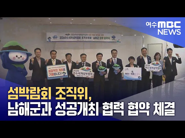 2026여수세계섬박람회 성공개최를 위해조직위원회가 국내.외 기관.단체들과의 협력 강화에적극 나서고 있습니다.섬박람회 조직위원회는 오늘(17),정기명 여수시장과 장충남 남해군수가섬박람회 성공개최 협력을 위한 협약을 맺고,앞으로 섬.해양 관광 활성화와 자지체관 운영, 해저터널 개통에 따른 공동 대응 등에 대해적...