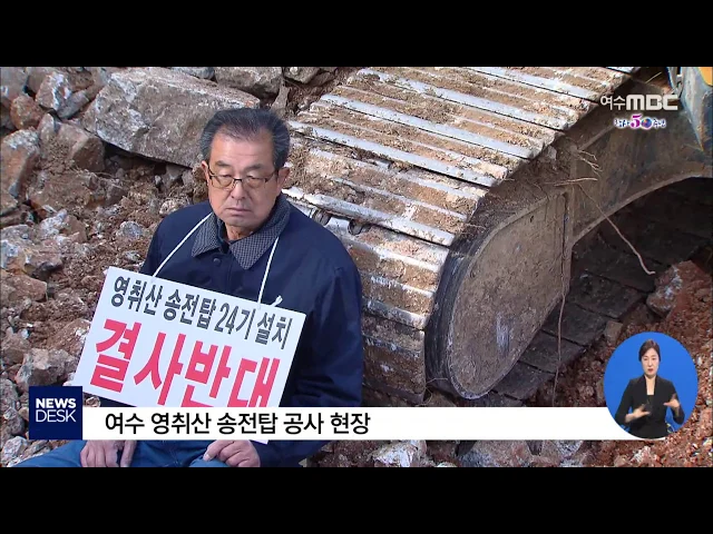 ◀ANC▶여수 영취산 고압 송전탑 설치에 대한 주민들의 반발이 공사 착공을 계기로 더욱 거세지고 있습니다. 주민 대표는 현장에서 단식농성에 들어갔고, 시의회등 지역각계도 한전과 시 행정에 문제를 제기하고 나섰습니다. 박광수 기자가 보도합니다.◀END▶여수 영취산 산주와 주민들이 공사현장 중장비 아래서 육탄저...