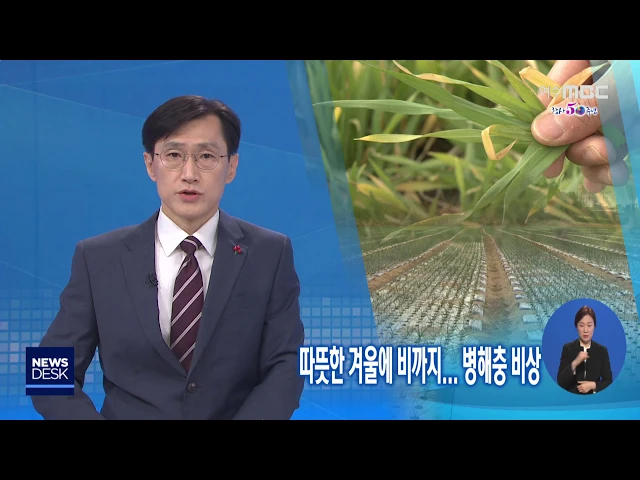 (앵커)겨울답지 않는 포근한 날씨와 함께 평년보다 비도 많이 내리는 온난 다습한 기후가 올 겨울 기온의 특성인데요. 겨울답지 않은 겨울 날씨로 병해충 발생 우려가 높아지면서 농촌에서는 시름이 깊다고 합니다. 이재원 기잡니다. (기자)한겨울 뿌르름의 상징 보리.하지만 올해는 다 자라기도 전부터 누렇게 고개를 숙이...