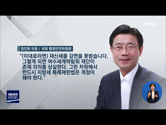 ◀ANC▶여수의 상징, '세계 박람회장'을 운영하는 엑스포 재단에 비상이 걸렸습니다. 지방세 감면이 올해로 종료되기 때문인데요,만일 세금이 제대로 부과되면 곧바로 운영 불가 상태에 빠질수 밖에 없는다급한 상황 입니다.박광수 기자가 보도합니다. ◀END▶지방세 특례제한법 제 54조 5항.//재산세와 취득세등의 감면...