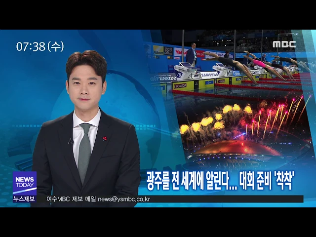전 세계 수영인들의 큰잔치인세계 수영대회가 오는 7월 광주에서 열립니다. 광주를 전 세계에 알리고 대회도 성공적으로 치르고..두 마리 토끼를 잡기 위한 대회 준비가 순조롭게 진행되고 있습니다. 정용욱 기자입니다(기자)오는 7월 세계 수영대회를 앞두고 염주체육관이나 남부대 수영장 등에서 시설 공사가 한창입니...