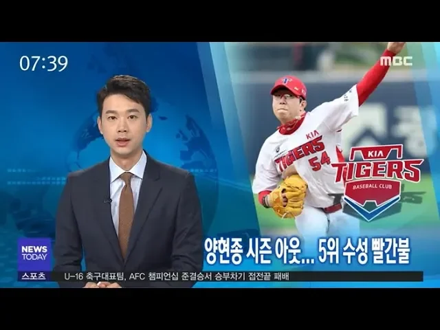 기아타이거즈의 5위 수성에빨간불이 켜졌습니다.에이스 양현종 선수가 정규 시즌에는 뛸 수 없게 됐습니다.박수인 기자 (기자)기아의 에이스, 양현종 선수가 홈런을 허용한 뒤 옆구리를 잡고 주저 앉습니다. ◀SYN▶(아 그런데 지금 양현종 선수 몸이 조금 안 좋은 것 같은데요. 허리 쪽이)정밀 검진 결과 오른...