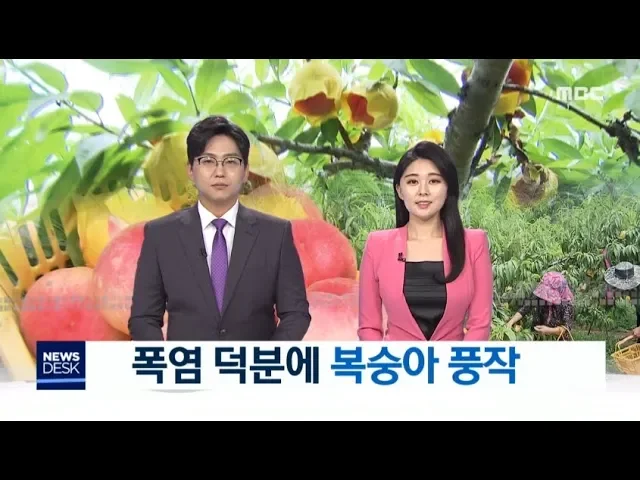 유례 없는 폭염으로 다들 힘들지만 이같은 날씨가 반가운 사람들도 있습니다.지역 복숭아 재배 농가들인데요 고온의 날씨가생산량 증가로 이어져농민들은 오랜만에 기분 좋은 수확작업에 나서고 있습니다.김종수 기자가 취재했습니다. ◀VCR▶강렬한 뙤약볕 사이로 큼직한 복숭아가 무르익고 있습니다.폭염에 지...