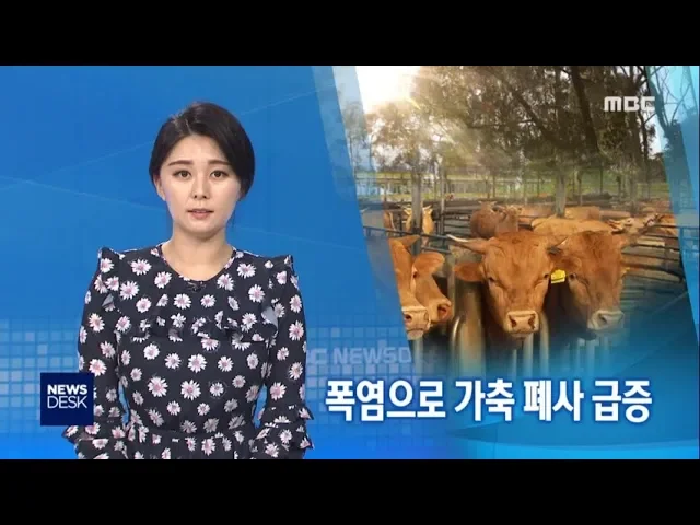 기록적인 찜통 더위에 가축 폐사 피해가 속출하고 있습니다.날씨가 너무 덥다보니 해수욕장을 찾는인파도 줄어들 정도입니다. 박영훈 기자입니다. ◀END▶ 200마리의 소를 키우는 축사. 오전 10시인데도 내부 온도가 38도까지 치솟습니다. 더위에 지친 소들의 먹이 섭취량도 평소의 50%대로 떨어졌고,움직이는 ...