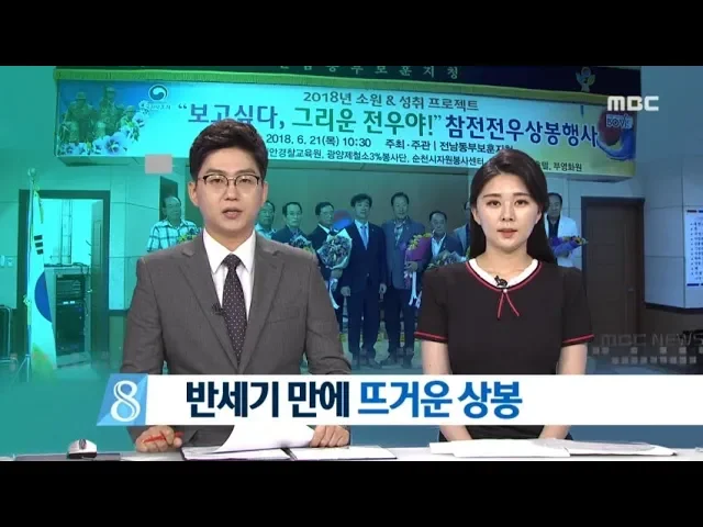 호국보훈의 달을 맞아 보훈당국이 참전 유공자들을 위해 상봉행사를 가졌습니다. 반세기 만에 상봉에 그 의미는 더욱 컸습니다. ///////////////////////////////////////// 전남지역 버스 노조가 파업 초읽기에 들어갔습니다. 여수와 순천, 광양, 목포 시내버스 노조는 오는 24일부터 이틀간 파업 찬반 투표를 진행합니다....