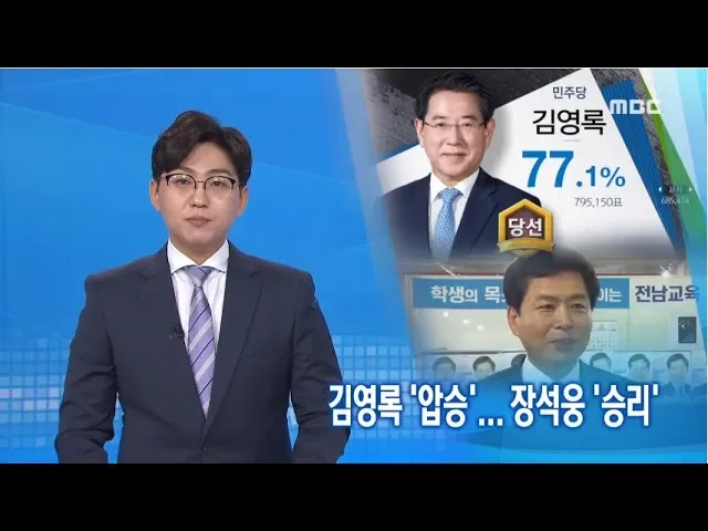 6.13 지방선거가 민주당의 압승으로 마무리된 가운데,전남지사 선거에서도 일찌감치 승기를 잡은 김영록 후보가 큰 표차로 당선됐습니다.교육감 선거에서는전교조 위원장 출신의 진보성향 장석웅 후보가문재인 마케팅의 강력한 드라이브를 꺾고당당하게 승리했습니다.최우식 기자가 보도합니다. ◀VCR▶이변은 ...