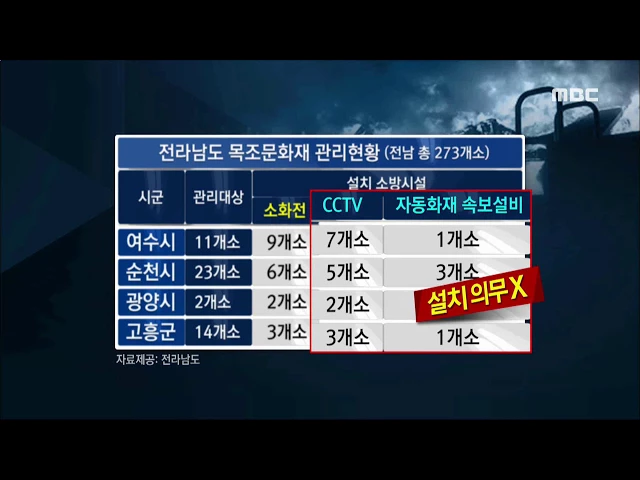 ◀ANC▶우리 주변에 분포된 문화재 대부분은 목재시설로 이뤄져 있습니다. 그만큼 화재에 취약한데요.하지만 소방설비가 제대로 갖춰진 곳이 많지 않아 철저한 대비가 요구되고 있습니다.김종수 기자가 보도합니다. ◀VCR▶지난 2009년 12월.전라남도 문화재자료 40호로 지정된 향일암에서 화재가 ...