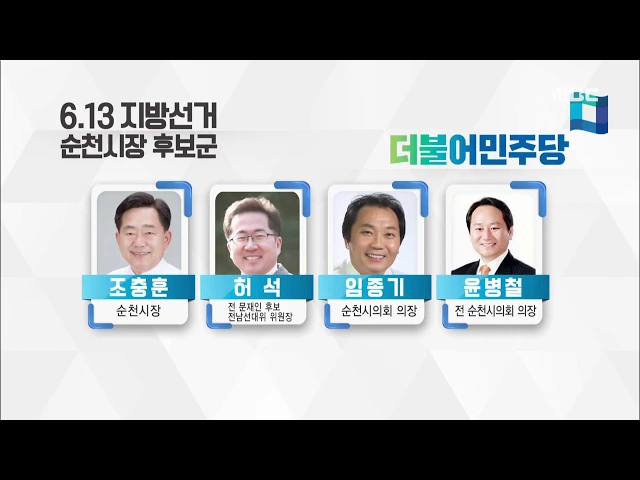 ◀ANC▶6.13 지방선거 자치단체장 후보군을 알아보는 시간오늘은 순천시장 편입니다.순천시장은 더불어민주당과국민의당 후보들이 난립한 가운데국민의당 분당이 출마 구도에 새로운 변수로 작용하고 있습니다.김종태 기자입니다. ◀END▶//더불어민주당은조충훈 현 시장의 3선 도전에허석 전 문...