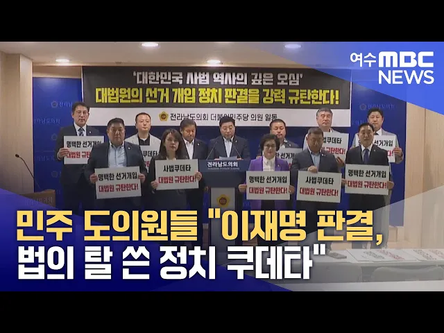 더불어민주당 소속 전남도의원들이이재명 민주당 대선 후보의 대법원 유죄 취지 파기환송 판결을 두고'법의 탈을 쓴 정치 쿠데타'라며 규탄했습니다.민주당 의원들은 오늘(2) 성명을 내고이번 판결이 대한민국 사법 역사에깊은 오심을 남긴 정치적 판단이라며 이같이 밝혔습니다.또, 이 후보의 당선을 막고윤석열 내란 수괴...
