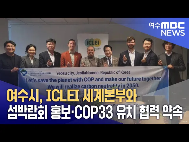 여수시가 최근, 이클레이, 세계지방정부협의회와 내년 섬 박람회 성공개최와 COP33 유치를 위한상호 협력 업무 협약을 체결했습니다.여수시 대표단은 최근, 독일 본에 있는 이클레이 세계본부를 방문해기후위기 대응과 탄소중립 실현을 위한 지방정부의 역할 확대와섬 박람회 홍보와 지원, COP33 유치를 위한 국제협력 강화...