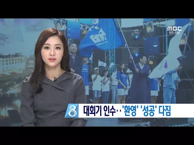 (앵커)부다페스트 폐막식 때차기 개최도시 자격으로 받은 대회기가광주에 도착했습니다.시민들은 대회기를 환영했고,조직위는 성공 개최를 다짐했습니다.송정근 기자입니다.(기자)흰색 셔츠에 청바지를 입은 시민들이흥겨운 노래에 맞춰 춤을 춥니다.2019세계수영선수권대회 성공을 기원하는시민들이 대회기 인수 환영행사...