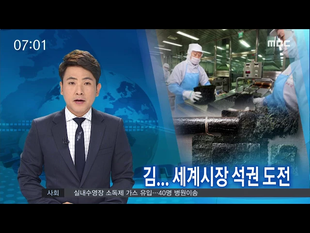 ◀ANC▶ 해외에서 라면보다 더 많이 팔리는 김은 농수산업계의 반도체라 불릴만큼 대표적인 수산물 수출 품목입니다. 이같은 분위기를 반영하듯 세계 김 시장 석권을 위한 다양한 프로그램이 실행되고 있습니다.박영훈 기자가 취재 ◀END▶ ◀VCR▶ 4년 전 가동을 시작한 전남의 김 ...