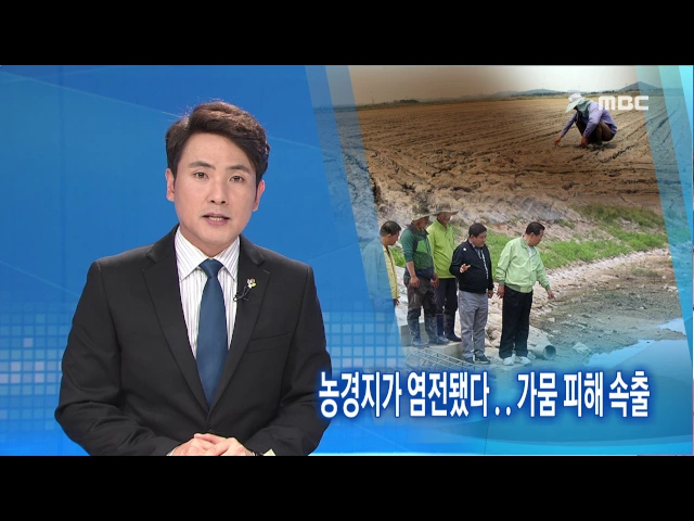 ◀ANC▶ 가뭄이 이어지면서 농사 피해가 속출하고 있습니다. 특히 간척지 논들은 염전으로 변해,모가 말라죽고 대체 작물도 어려워 한해 농사를 망치게 생겼습니다.신광하 기자가 보도 ◀END▶ ◀VCR▶ 지난 달 중순 모내기를 끝낸 전남의 한 해안가 간척지 논입니다. 논바닥은 말라 ...