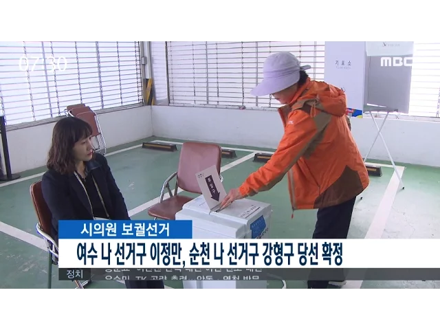 어제(12) 치러진 지역 보궐선거 개표가 마무리돼 당선인들에게 당선증이 교부됐습니다.각 지역선거관리위원회에 따르면여수시 나 선거구에서국민의당 이정만 후보가 2,594표를 얻어 득표율 34.31%로,순천시 나 선거구에서더불어민주당 강형구 후보가 1,782표를 얻어 득표율 31.39%로각각 시의원에 당선됐습니다.이에 따라 ...