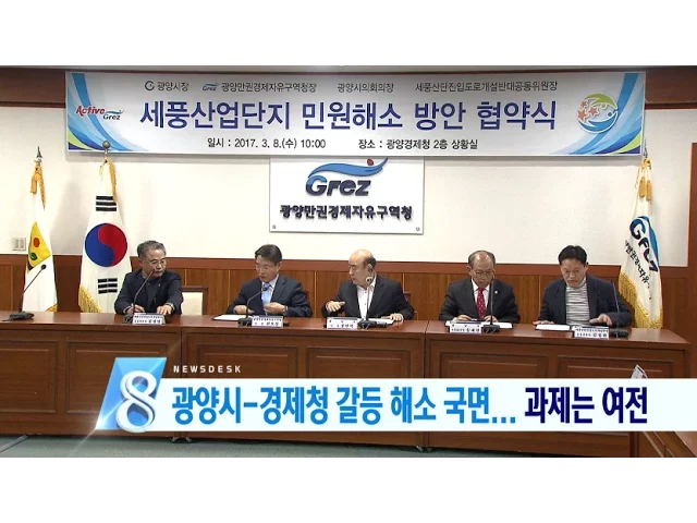 //////////////////////////////////////세풍산단 개발을 둘러싼광양시와 경제청간의 갈등이 해소될 전망입니다오늘 업무협약을 맺었는데풀어야 할 문제가 아직은 많습니다./////////////////////////////////////////순천만 스카이큐브 노선 연장 논란이 재연될 조짐입니다.운영업체는 불가피성을 강조하지만,시민환경단체...