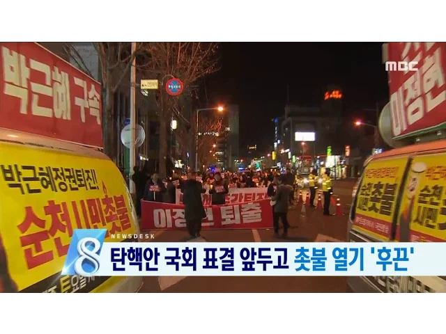 ◀ANC▶박근혜 대통령 탄핵안 처리가 하루 앞으로(8일 기준) 다가오면서국회는 물론 전국 곳곳에서 밤샘 농성이 이어지고 있습니다.지역 시민들도 촛불집회에 동참하며 탄핵안 통과에 목소리를 높이고 있는데요.현장에 나가 있는 취재기자 연결하겠습니다. 문형철 기자, 집회 분위기는 어떤가요? ◀V...
