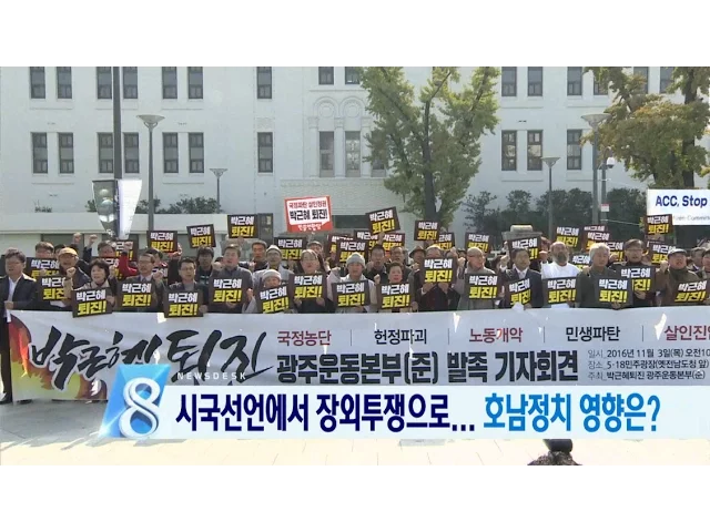 연이은 국정농단 파문이 시국선언에서 장외투쟁으로 이어지고 있습니다 최순실 사태이후 이어지고 있는 청와대와 정부의 인사가호남정치에 어떤 영향을 미칠지 전망했습니다.////////////////////////////////////////박근혜 대통령 퇴진 순천시민운동본부가 시국선언과 함께 출범했습니다.부영 그룹은 케이 스포츠 재단과...
