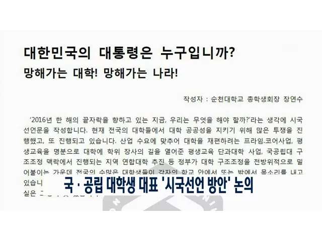 '최순실 게이트'와 관련해국·공립대학교 학생들이순천대에서 시국선언 방안 등을 논의합니다. 전국 국·공립대학생연합회에 소속된총학생회장 등 30여 명은 오는 29일 순천대에서 연석회의를 열고 교육부 재정지원 사업의 문제점과 함께'최순실 게이트'에 대한 시국선언 자료를 공유하고 향후 대응 방안을 논의할 계획입니다...