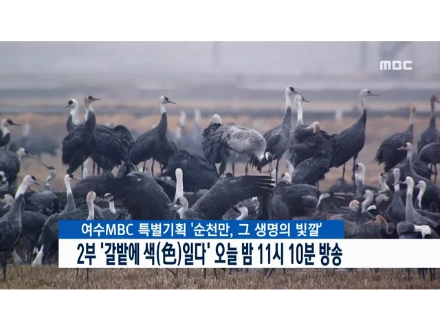 순천만의 생태계를 '색'이라는 매개체를 통해 새롭게 조명한여수MBC 특별기획 다큐멘터리 '순천만, 그 생명의 빛깔' 2부가오늘(5) 밤 11시 10분부터 방송됩니다. 제2부 '갈밭에 색 일다'에서는 흑두루미와 물수리, 노랑부리 저어새 등순천만에서 월동하는 철새와 다양한 생명체의 모습을생생한 영상으로 담아냈습니다. 특히...