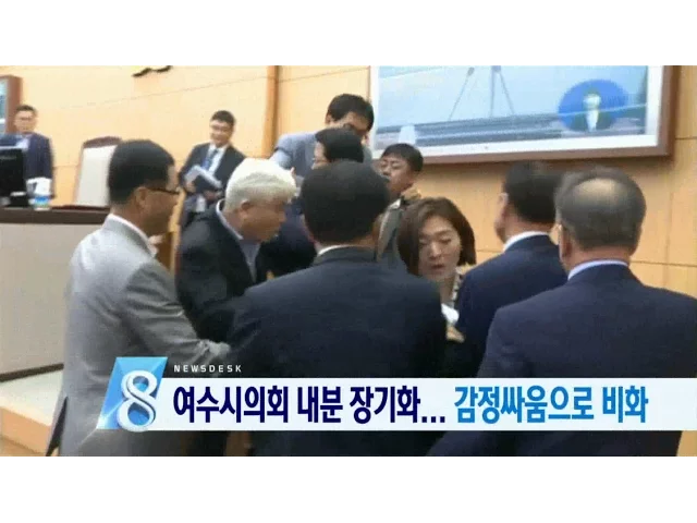 ◀ANC▶여수시의회 의장 선거과정에서돈 거래 의혹이 제기되면서 시작된의회 내분이 갈수록 확산되고 있습니다.본 회의장에서 발생한여성 의원과의 몸싸움이 고소전으로 비화되면서의원들간의 감정 싸움으로 번지고 있습니다.김종태 기자. ◀VCR▶지난달 28일 여수시의회 본회의장더불어민주당 일부...