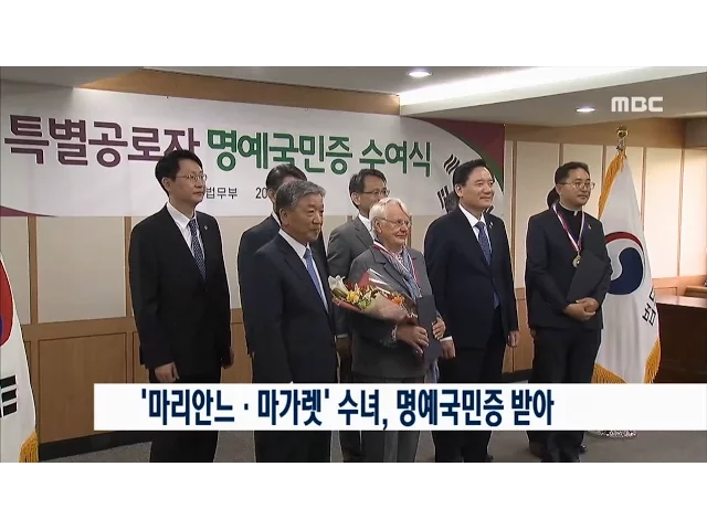 '소록도 천사'로 불린마리안느, 마가렛 수녀가대한민국 명예국민이 됐습니다.법무부는 오늘(8) 40여 년 동안 소록도에서 한센인을 간호한마리안느와 마가렛 수녀에게 명예국민증을 수여했습니다. 외국인에게 명예국민증이 주어진 것은 히딩크 감독 이후 두번째로 이들 수녀에게는 장기체류 희망 시 영주자격 부여 등의 행...