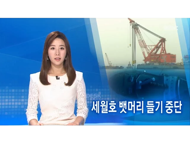 ◀ANC▶ 어제(12일)까지만 해도 순조로워 보였던 세월호 선수들기 작업이 너울성 파도 때문에 중단됐습니다. 목표치의 절반 가까이 들어올렸던 뱃머리가다시 내려 앉으면서 작업은 또 다시 2주가 연기됐고, 선체 일부가 손상됐습니다. 김진선 기자입니다. ◀END▶ ◀VCR▶ 이번 물때에 마...