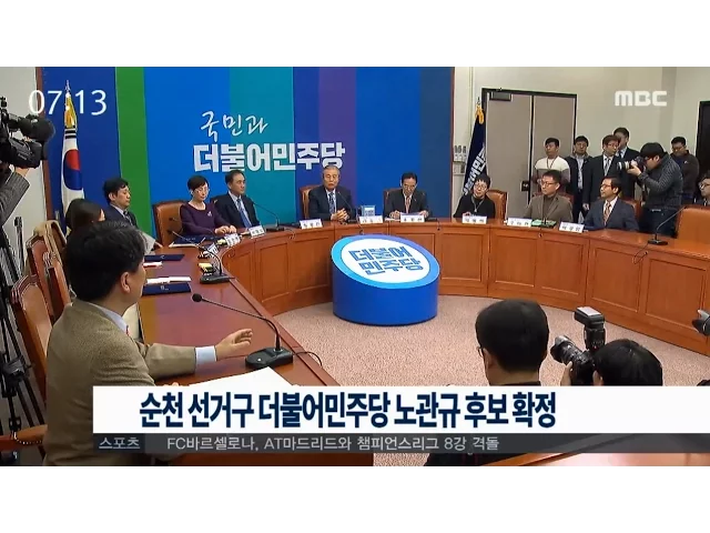 순천 선거구 더불어민주당 경선에서노관규 전 순천시장이 최종 후보로 확정됐습니다.어제(18일)밤 더불어민주당의 경선후보자 발표 결과노관규 후보는 휴대폰 여론조사에서 53.06%의 지지를 얻어46.1%에 가산점 4.6%를 얻은김광진 후보를 따돌렸습니다. 노 후보는 이에따라새누리당 이정현 후보와 국민의 당 구희승, 손훈...