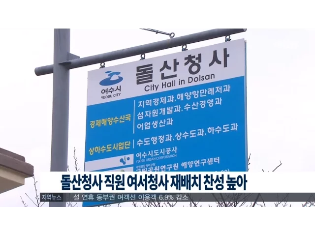여수시가 추진하고 있는돌산청사 직원 재배치와 관련해시민 가운데 절반 정도가여서청사 활용안을 지지하는 것으로 나타났습니다.여수시가 지난달 22일부터 나흘동안SNS를 통해 시민 143명을 대상으로돌산청사 직원 재배치 장소에 대한의견을 수렴한 결과45.8%가 2청사인 여서청사 활용안을 지지했고, 본 청사 활용안은 13....
