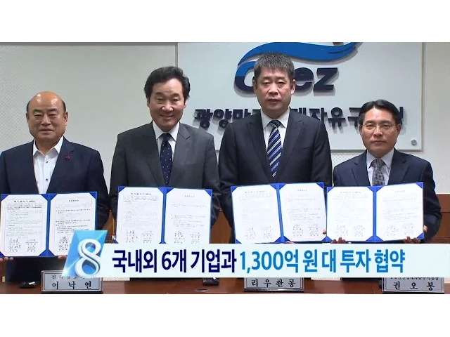 광양만권 경제자유구역청이 국내외 6개 기업과1369억 규모의 투자 협약을 체결했습니다.광양만권 경제자유구역청은 오늘 전라남도, 순천시, 광양시 등이 참석한 가운데 요녕 푸동 국제투자집단 유한공사, 솔섬 등 중국과 일본, 수도권 등지에 본사를 둔 6개 기업이 참석한 가운데1369억원 규모의 투자 협약을 체결했습니다....