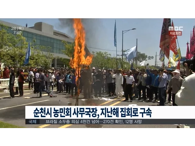 지난해 5월 한국농수산식품유통공사 앞에서 열린 밥상용 쌀 수입 저지 집회 과정에서 경찰관을 다치게 한 혐의 등으로 순천시 농민회 사무국장 채 모 씨가 최근구속됐습니다.한국농민회총연맹 광주전남연맹은 이에 대해쌀값이 20년 전 수준인 현 상황에서농민들의 생존권을 지키기 위한 집회였으며,집회가 열린 지 오래돼 ...
