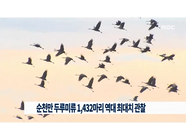 순천만에서 월동 중인 두루미류가 역대 최대치를 기록하고 있는 것으로 관찰됐습니다.순천시에 따르면 현재 람사르 습지 순천만에서 월동 중인 흑두루미를 비롯해 재두루미, 검은목두루미 등 두루미류가 모두 석종에 천432마리가 관찰돼 역대 최대치를 갱신했다고 밝혔습니다. 이는 천학이 도래한 지난 겨울 최대치인 두루...