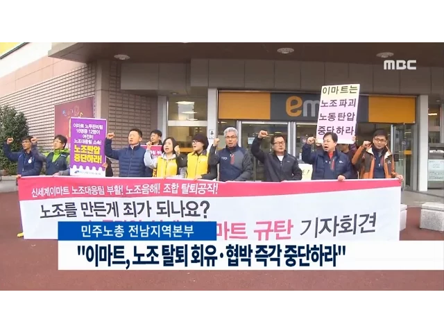 지역 노동단체가 이마트를 상대로노조 탄압행위를 중단할 것을 촉구했습니다.민주노총 전남지역본부는오늘(23) 순천과 목포지역 이마트 앞에서기자회견을 열고 이마트 관계자들이 노조원의 집을 찾아가거나 면담을 통해 노동조합에서 탈퇴하라며노조원들을 회유, 협박하고 있다고주장했습니다.노동단체는이 같은 회사 측의...