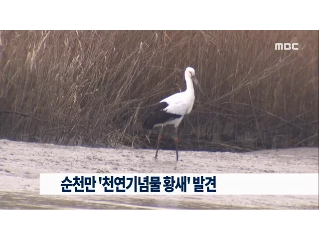 천연기념물 199호 황새 1마리가 오늘, 순천만 갯벌에서 관찰됐습니다.순천만에서 천연기념물 199호 황새 관찰된 것은 지난 1996년 이후 여섯 번째로,이번에 확인된 황새는 초록색과 파랑색 가락지를 부착한 채 순천만 갯벌에서 먹이활동을 하다 관찰됐습니다.천연기념물 황새는 세계적으로 2천 500여 마리 밖에 남지 않아...
