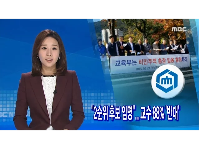 ◀ANC▶2순위 후보자 총장 임용 파문이수그러들지 않고 있습니다. 시민·사회단체들은 박진성 신임 총장의 용퇴를 요구하고 나섰고,순천대 교수들도 정부의 이번 총장인사를 받아들이지 않기로 결정했습니다.보도에 문형철 기자입니다. ◀VCR▶ --- Effect ---"국립대학 통제하는 박근혜 정부 ...