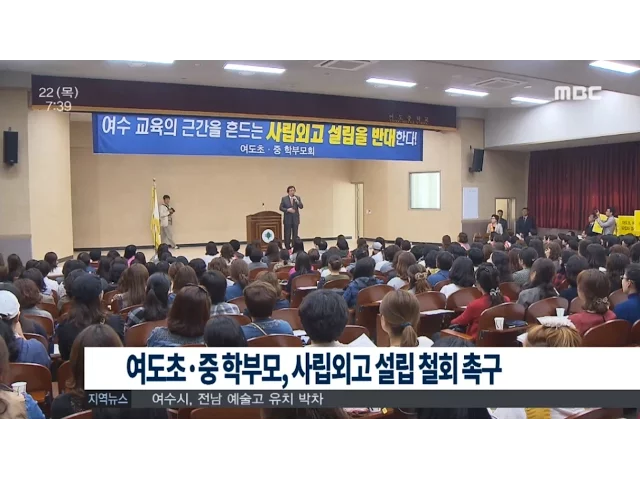 여수시 사립외고 설립과 관련해외고 부지 예정 학교의 학부모들이반대하고 나섰습니다.여도초.중학교 학부모 4백여 명은 어제(21) 사립외고 저지 결의대회를 갖고, 사립외고 설립과 여도 초중학교의 공립화는 여수의 교육 문제를 해결하는 대안이 될 수 없다고 주장했습니다.이들은 오늘(22) 여수시청 앞에서 대규모 집회...