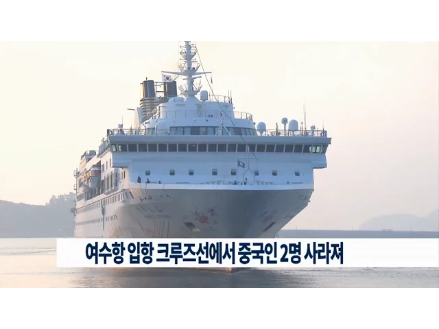 이 배로 여수항에 입항한중국인 관광객 2명이 사라져 출입국 당국이 조사에 나섰습니다.오늘(20) 오전 여수항 크루즈부두에중국선적 '중화태산호'가 입항해7백여명의 관광객이 여수시내 관광과 쇼핑에 나섰지만,오후 1시쯤 2명이 종적을 감춘 이후오후 6시, 중국 청도로 출항하기 전까지승선하지 않은 것으로 드러났습니다...